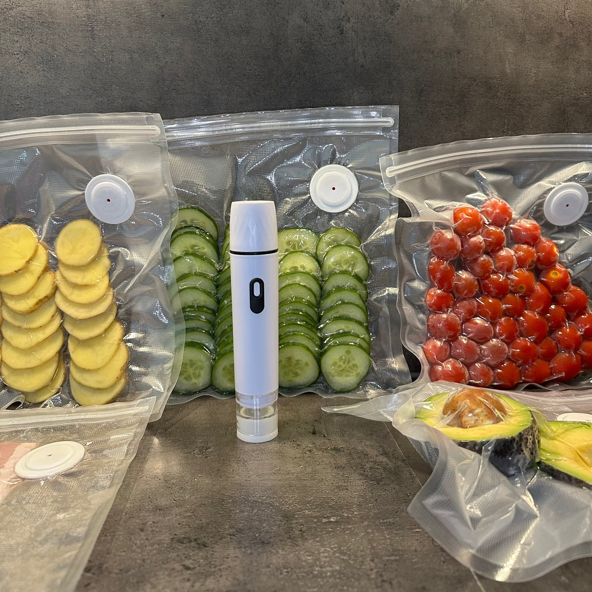Das Herzstück des Sets ist der wiederaufladbare FreshLock – kompakt, leicht und kabellos einsetzbar. Er arbeitet mit starker Saugkraft, ist aber dennoch besonders leise. Dank der wiederverwendbaren Premium-Beutel sparst du nicht nur jede Menge Einwegplastik, sondern trägst auch aktiv zu mehr Nachhaltigkeit bei. Einfach befüllen, verschließen, Luft absaugen – und schon sind deine Vorräte sicher gelagert.
